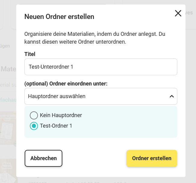 Anschließend wählst du einen aussagekräftigen Titel für den Ordner aus. Wenn du bereits mehrere Ordner erstellt hast, kannst du den neuen Ordner einem anderen unterordnen, um eine noch klarere Hierarchie zu schaffen.