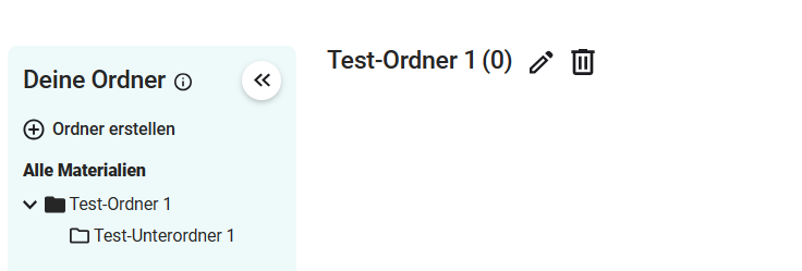 Falls du einen Ordner vollständig löschen möchtest, klicke einfach auf das Mülleimer-Symbol neben dem Titel des Ordners. Beachte, dass dabei alle Unterordner des gewählten Ordners ebenfalls gelöscht werden. Allerdings bleiben deine Materialien unberührt und sind weiterhin unter "Alle Materialien" verfügbar und auffindbar.