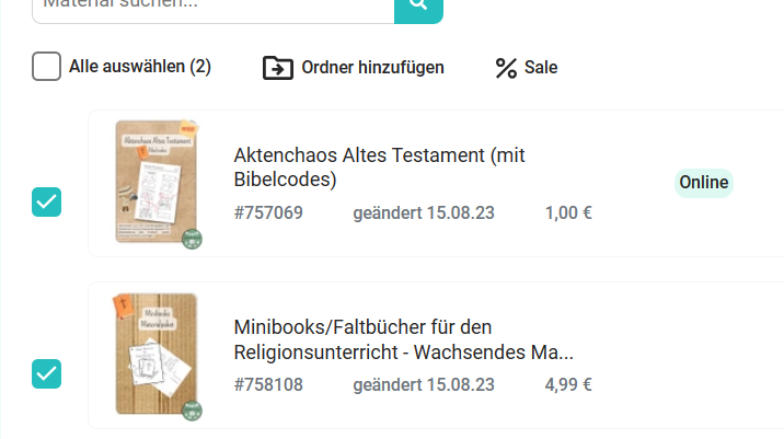 Wenn du die Ordnerverwaltung auf deinem Smartphone nutzt, klicke zunächst auf "Mehrfachauswahl", um in den Auswahlmodus zu gelangen. Dadurch kannst du mehrere Materialien gleichzeitig einem Ordner zuweisen. In diesem Modus hast du auch die Möglichkeit, mehrere Materialien gleichzeitig in den Sale zu setzen, zu pausieren oder in deinem Profil hervorzuheben. Es ermöglicht dir sogar, einen ganzen Ordner mit nur wenigen Klicks in den Sale zu setzen.