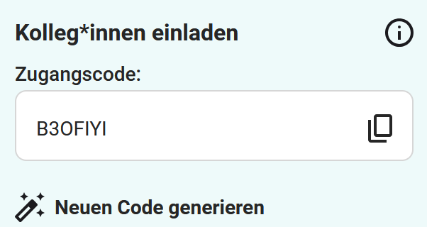 Du erhältst nun eine Übersicht, wer deiner Schule beigetreten ist. Zudem findest du hier den Zugangscode und kannst Kolleg*innen hinzufügen und entfernen. Um Kolleg*innen hinzuzufügen, musst du ihnen den Zugangscode zukommen lassen: