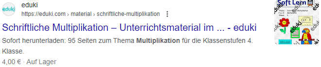 Die Beschreibung bietet dem Seitenbesucher einen ersten Überblick über den Inhalt und den möglichen Einsatz des Materials. Sie hilft dem Besucher auch bei der Kaufentscheidung. Für Google bietet sie zusätzliche Information, ob die Seite für ein Keyword relevant ist.
