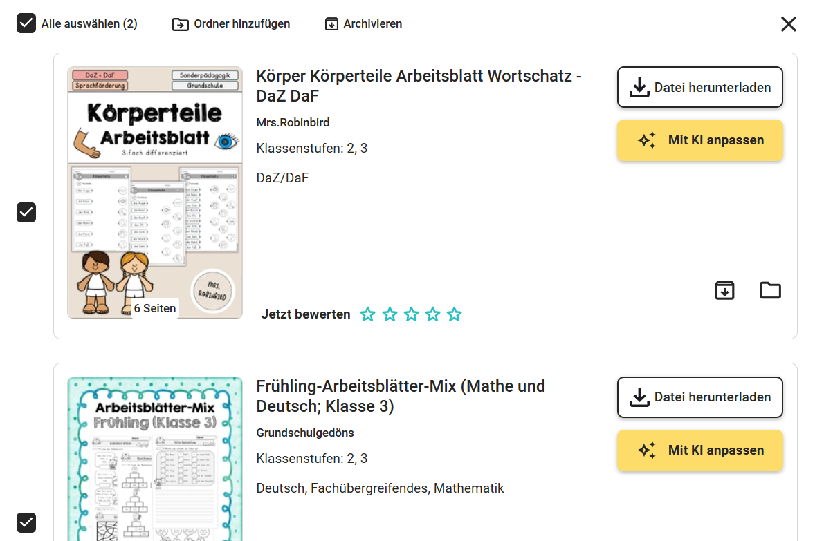 Du kannst dein Material sowohl einzeln als auch mit Hilfe der Mehrfachauswahl archivieren. Gehe dazu zu deiner Materialansicht und nutze das Ordnersymbol mit dem nach unten zeigenden Pfeil.