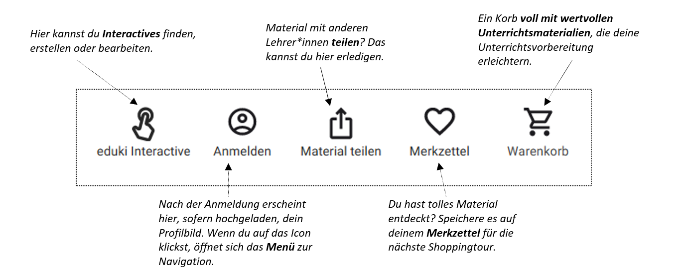 Die Symbolleiste oben rechts ist deine erste Begegnung mit der Navigation von eduki. In der folgenden Übersicht siehst du, was die einzelnen Symbole bedeuten: