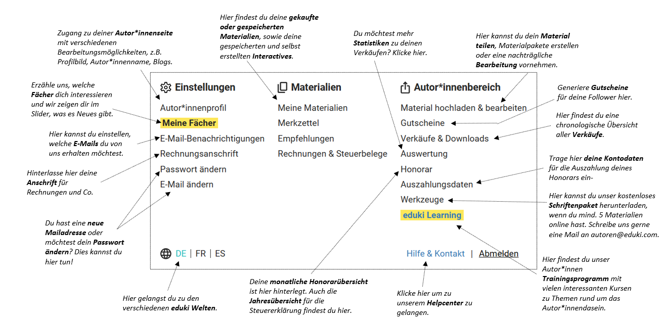 Das Menü führt dich zu verschiedenen Bereichen in deinem Autor*innen Cabinet. Die linke Seite beinhaltet vor allem grundlegende Einstellungen und sowie den Zugang zu deiner Autor*innenseite. Im Mittelteil findest du alles rund um deine gekauften Materialien und um Material, welches für dich zukünftig spannend sein könnte. Im dritten Teil ganz rechts findest du alles rund um dein Autor*innendasein, also um deine erstellten Materialien, dein Honorar und eine Vielzahl von verschiedenen Hilfsmitteln.