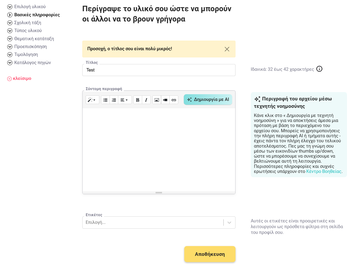 Στο eduki αναζητούμε συνεχώς τρόπους να διευκολύνουμε τη δουλειά των συγγραφέων μας και να την κάνουμε πιο αποδοτική. Η λειτουργία τεχνητής νοημοσύνης στη διαδικασία μεταφόρτωσης έχει σχεδιαστεί ακριβώς γι’ αυτό: αξιοποιεί τις δυνατότητες της τεχνητής νοημοσύνης για να σας βοηθήσει να δημιουργείτε περιγραφές υψηλής ποιότητας για τα διδακτικά σας υλικά. Σε αυτό το άρθρο του Κέντρου Βοήθειας θα βρείτε πληροφορίες για το πώς λειτουργεί καθώς και απαντήσεις σε συχνές ερωτήσεις.