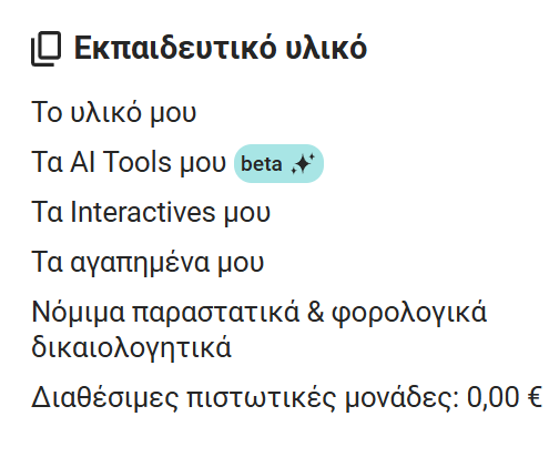 Ο κατάλογος των εργαλείων που έχουμε λανσάρει από την 1η Αυγούστου 2025 είναι ήδη εκτενής: έχεις τη δυνατότητα να τα ανακαλύψεις στο προφίλ σου και να μοιραστείς τις εντυπώσεις σου μαζί μας! Μπορείς να βρεις τα εργαλεία τεχνητής νοημοσύνης στα σημεία του μενού του προφίλ σου, αλλά και ως επιλογή στον προσωπικό σου χώρο, δίπλα σε κάθε τίτλο υλικού σου (βλέπε συνημμένες εικόνες).