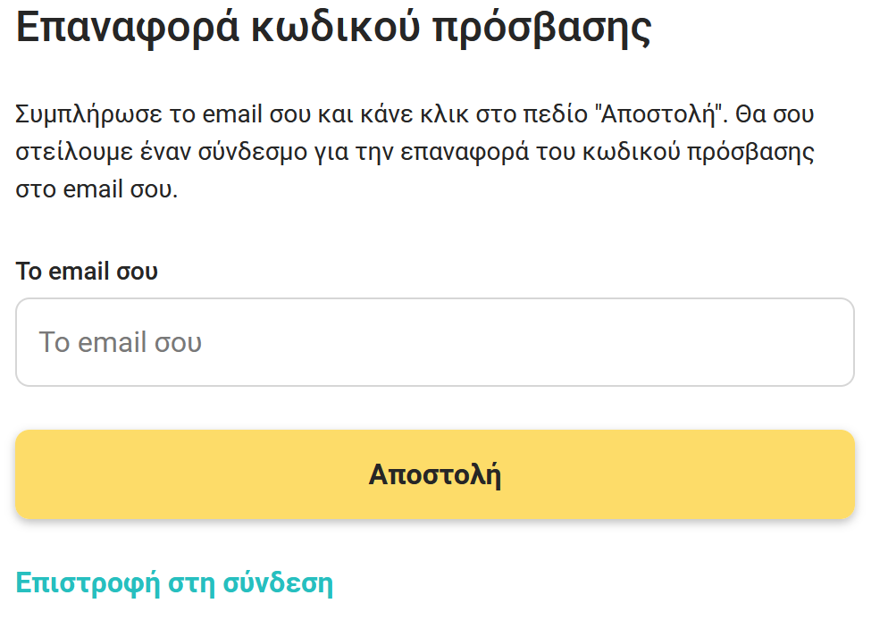 Εάν έχεις ξεχάσει τον κωδικό πρόσβασής σου, μπορείς να τον επαναφέρεις και στη συνέχεια να δημιουργήσεις έναν νέο. Για να το κάνεις αυτό, κάνε κλικ στη "Σύνδεση" στο επάνω μέρος της σελίδας και στη συνέχεια στο "Ξέχασα τον κωδικό πρόσβασης". Τώρα θα ανοίξει η σελίδα "Επαναφορά κωδικού πρόσβασης". Εισάγαγε εκεί τη διεύθυνση email σου, ώστε να μπορέσεις να λάβεις ένα email για τη δημιουργία ενός νέου κωδικού πρόσβασης.