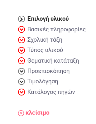 Στο παραπάνω παράδειγμα μπορείτε να δείτε ότι λείπει κάτι από τις βασικές πληροφορίες, την σχολική τάξη, τον τύπο υλικού, τη θεματική κατάταξη και των κατάλογο πηγών.