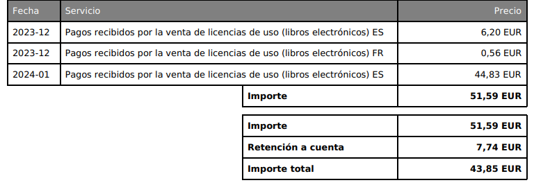 En tu nota de crédito encontrarás por separado las deducciones por retención en origen. Este es un ejemplo de una nota de crédito cuyo/a autor/a tiene su residencia fiscal en un país con un acuerdo de imposición residual del 15%:
