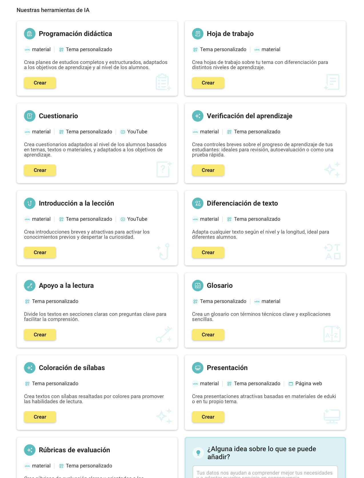 En eduki, seguimos centrándonos en los materiales creados por el profesorado. Nuestras herramientas de IA están diseñadas para facilitar vuestro trabajo, ayudándoos a mantener la creatividad, ahorrar tiempo y garantizar la calidad.
