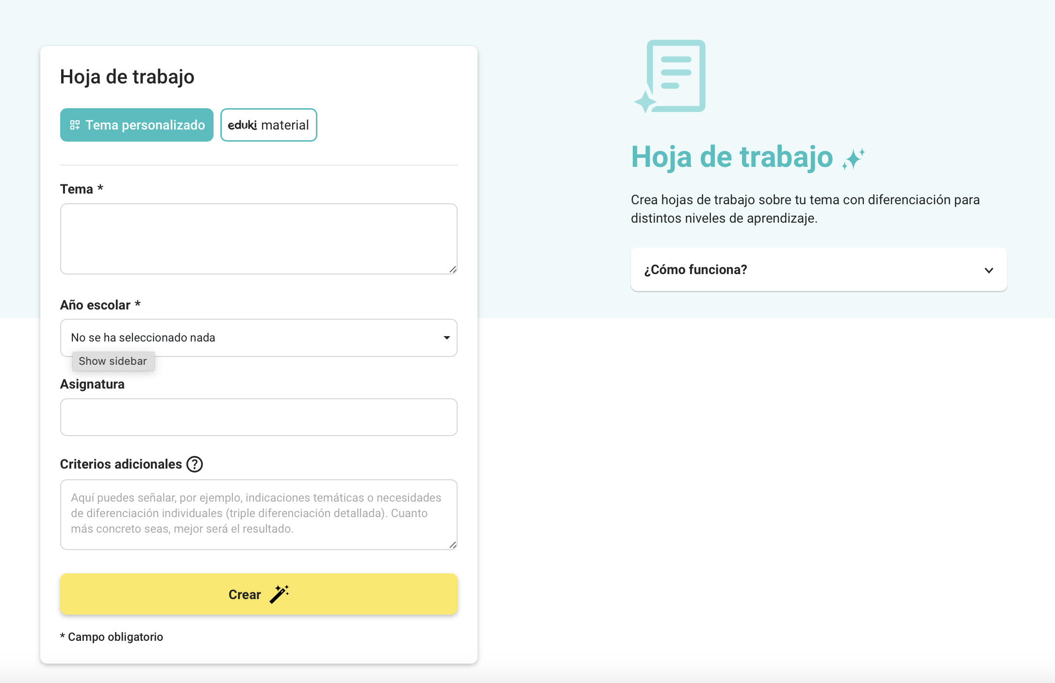 En cuanto al idioma de los contenidos, es importante que sepas lo siguiente: cuando se trata de material dirigido a alumnos (por ejemplo, hojas de trabajo), el idioma de los contenidos siempre se basa en el idioma de las instrucciones. Si se trata de material para profesores (por ejemplo, ideas para empezar la clase), el idioma de los resultados se basa en el mundo eduki en el que se encuentra el usuario. Si estás en la página web alemana, los resultados serán en alemán, a menos que se especifique lo contrario en las instrucciones.