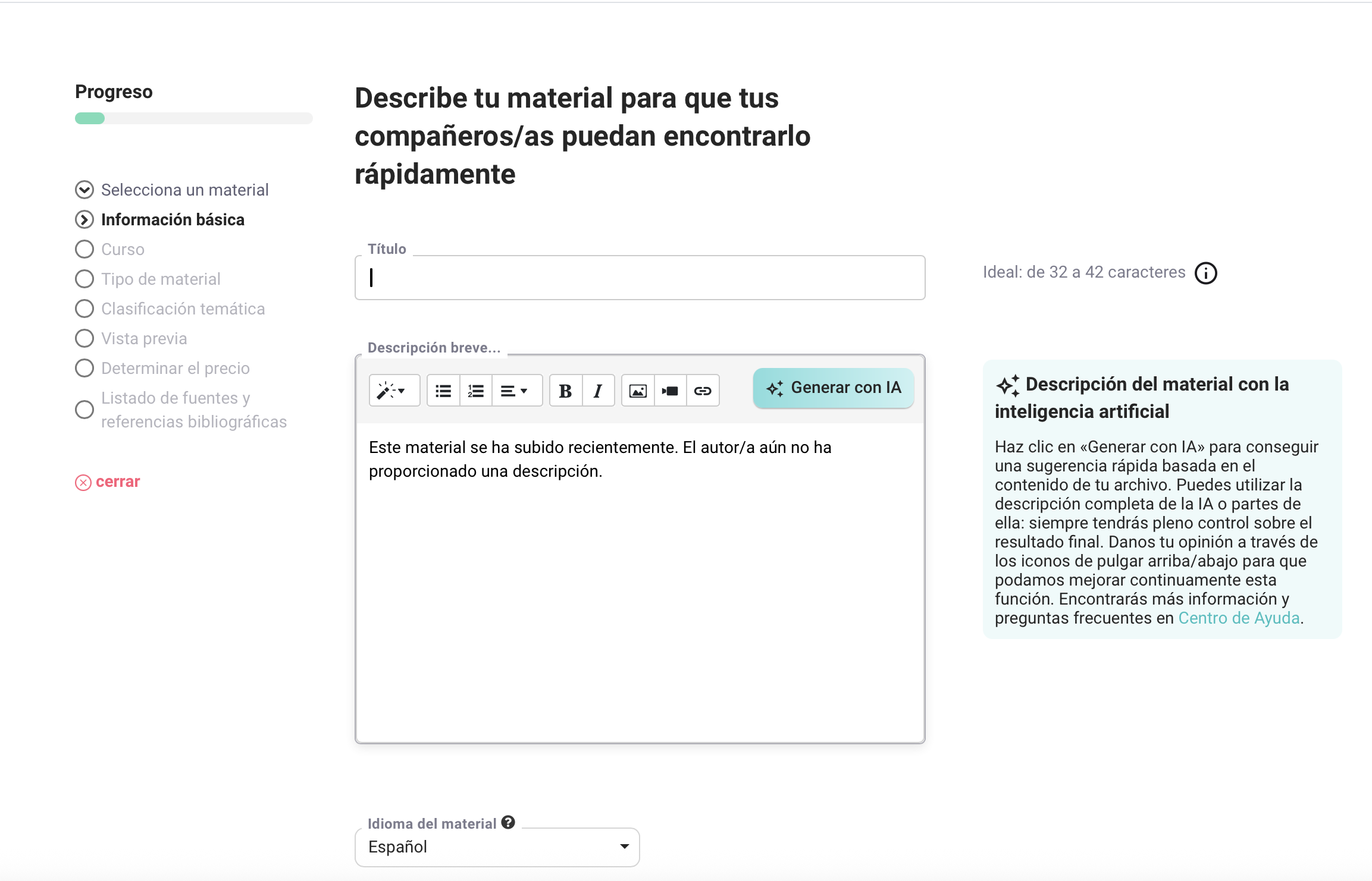 Consejo: Si la descripción no te satisface, ¡prueba nuestro asistente de inteligencia artificial! Analiza tu material y crea automáticamente una descripción sugerida, ¡que puedes personalizar como quieras!