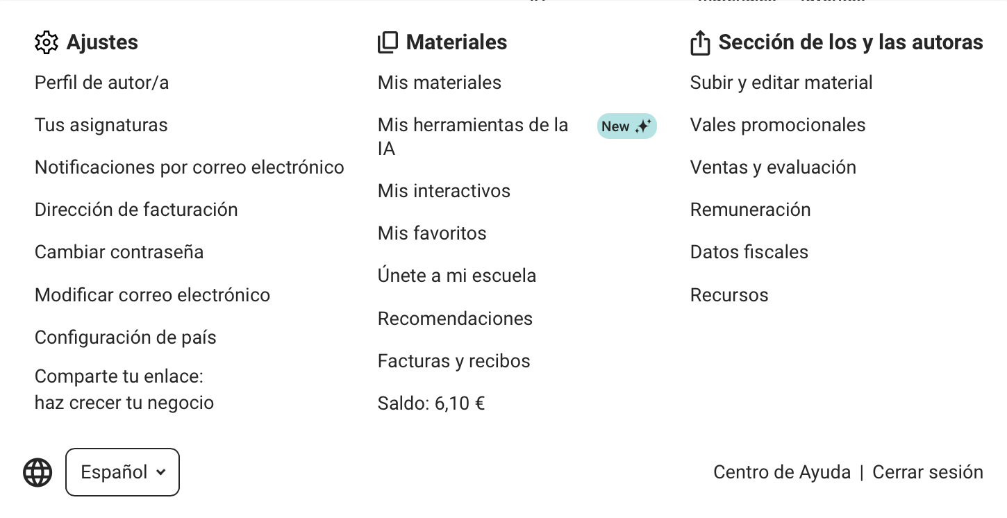 El menú te guía a diferentes secciones de tu área de autor/a. En la parte izquierda encontrarás la configuración básica y el acceso a tu perfil de autor/a. En la sección central verás todo lo relacionado con los materiales que has comprado y el material que podría interesarte en el futuro. En la tercera sección, en el extremo derecho, encontrarás todo lo relacionado con tu actividad como autor/a, es decir, el material que has creado, tus ingresos y una variedad de herramientas diferentes.