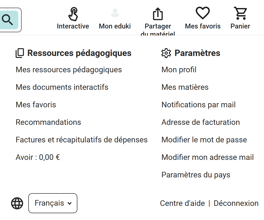 Nous te recommandons de te créer un compte gratuitement sur eduki. Cela te permet d’avoir accès à tout moment aux ressources que tu as achetées ou téléchargées. C’est très pratique lorsque les auteur·es modifient ou améliorent le matériel que tu as déjà. C’est également l’endroit où tu trouveras tes factures et les récapitulatifs de tes dépenses : tu pourras notamment regarder si nous avons bien reçu ton paiement (grâce à la mention “payé”) ou obtenir un récapitulatif annuel de tes achats. Grâce aux favoris, tu pourras aussi sauvegarder les ressources pédagogiques qui te plaisent pour ne pas manquer les promotions de leurs auteur·es.