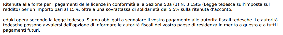 Se la tua residenza fiscale è situata fuori dalla Germania, può avvenire che eduki - società di diritto tedesca - sia obbligata ai sensi dell'art. 50c della EStG (legge sull'imposta sul reddito) a trattenere dai tuoi compensi la cosiddetta imposta di ritenuta alla fonte (Quellensteuer), pari a circa il 16%. Tuttavia, poiché la Germania ha siglato convenzioni contro la doppia imposizione con diversi altri Paesi, è possibile evitare tale imposizione o ridurla.