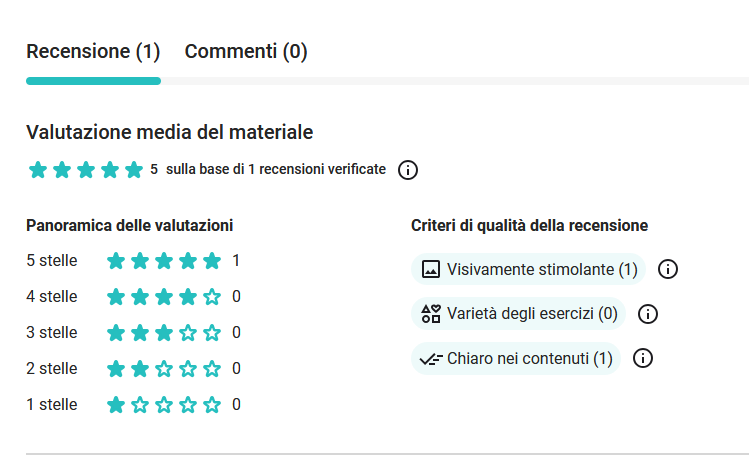 Nella descrizione del materiale, puoi invece spiegare in modo più dettagliato come lo hai usato. Lo hai usato come materiale per il lavoro individuale o per il lavoro in gruppi? Oppure hai lavorato con l'intera classe? Se, ad esempio, oltre ai fogli di lavoro il materiale comprende pagine di esercizi (ad es. per il lavoro a stazioni) e pagine di soluzioni (ad esempio per l'autoverifica), puoi scriverlo qui. Puoi anche indicare se sono necessari altri materiali (ad es. un cubo a colori). È importante che tutti sappiano dalla descrizione a cosa serve il materiale e come può essere utilizzato.