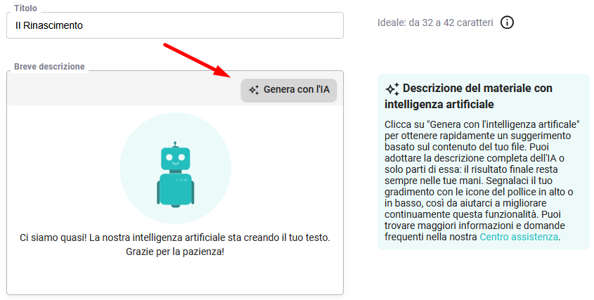 La tua descrizione non ti convince? Metti alla prova il nostro assistente IA: genererà una descrizione basata sull'analisi del tuo materiale, che potrai poi correggere non appena sarà pronta!