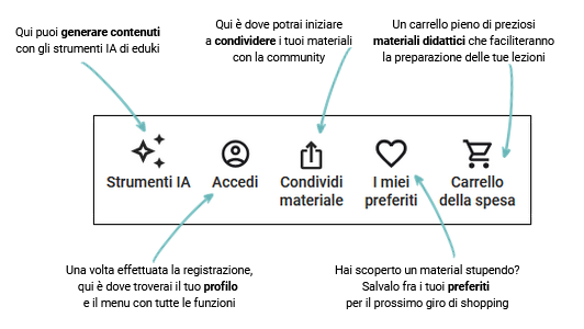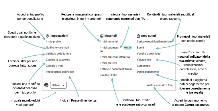 Il menu ti consente di accedere a diverse sezioni del tuo account. Nella parte sinistra troverai le impostazioni di base e l'accesso alla tua pagina autore/autrice. Nella sezione centrale troverai tutto ciò che riguarda i materiali acquistati e quelli che potrebbero interessarti in futuro, ma anche gli strumenti IA di eduki e gli Interactive. Nella terza sezione, infine, troverai tutto ciò che riguarda la tua attività come autore/autrice, dal tuo spazio personale agli indicatori su vendite e visualizzazioni ai dati per il pagamento.