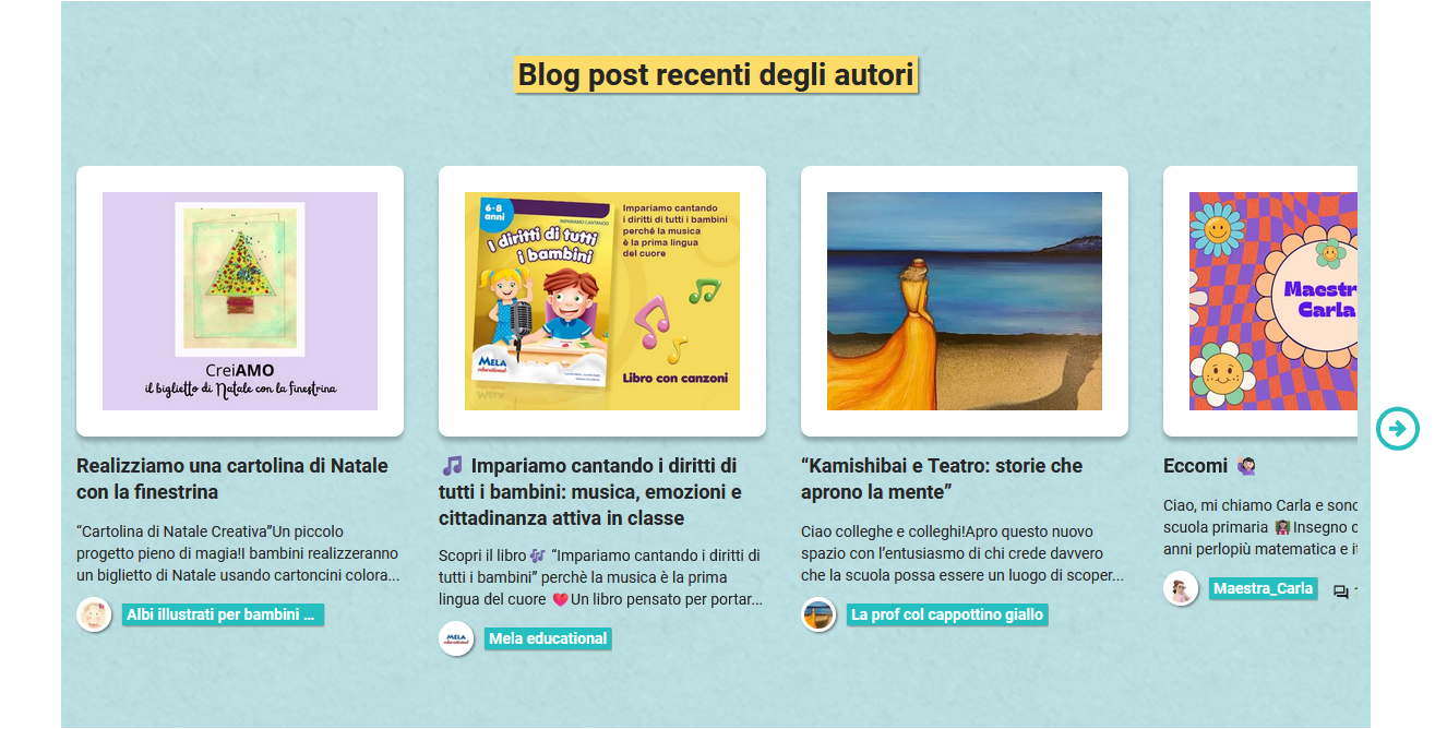 Oltre a cercare il materiale didattico adatto, le nostre e i nostri utenti amano cliccare e leggere i post del blog. Utilizza questo strumento di comunicazione per presentarti come autrice o autore e scrivere un articolo interessante. Non deve riguardare per forza un argomento collegato al materiale che hai caricato, anzi. Dovrebbe riguardare argomenti di richiamo che siano di particolare interesse per chi opera nel mondo dell'educazione: discussioni attuali del panorama educativo, questioni stagionali, la tua opinione su argomenti di scuola.