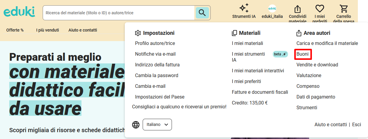 Per creare un buono dal tuo profilo, apri il menu cliccando sulla tua immagine nella barra superiore. Seleziona quindi "Buoni" nel menu: accederai alla sezione in cui potrai impostare una promozione e generare il relativo codice da condividere coi tuoi follower.