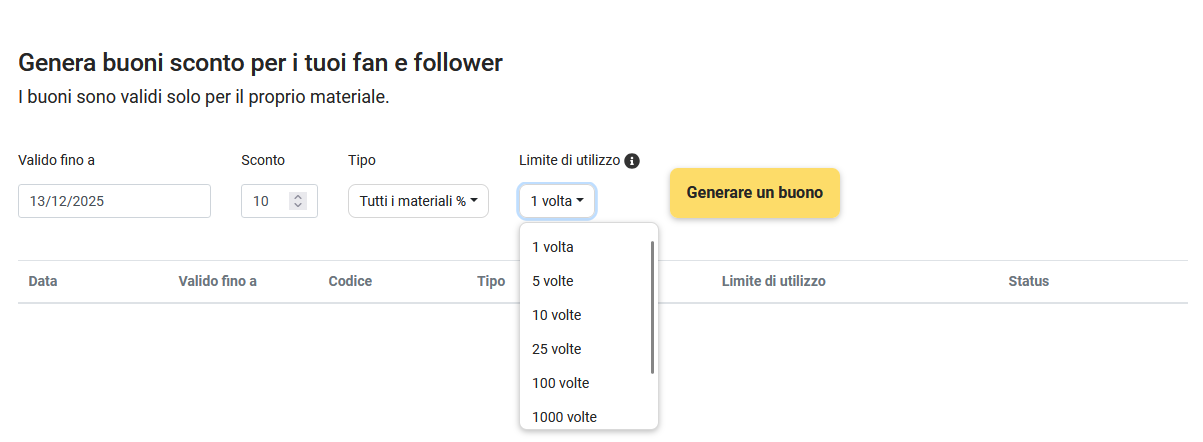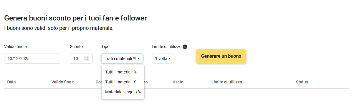 ‘Tutti i materiali %’: scegliendo questa opzione, creerai un buono con uno sconto percentuale valido su tutti i tuoi materiali. Il buono potrà essere inserito alla fine dell'acquisto, quindi l'utente che lo riceverà potrà scegliere tutti i materiali che vorrà. Ad esempio, un buono del 10% consentirà all'utente di avere il 10% di sconto su tutti i tuoi materiali presenti nel suo carrello.